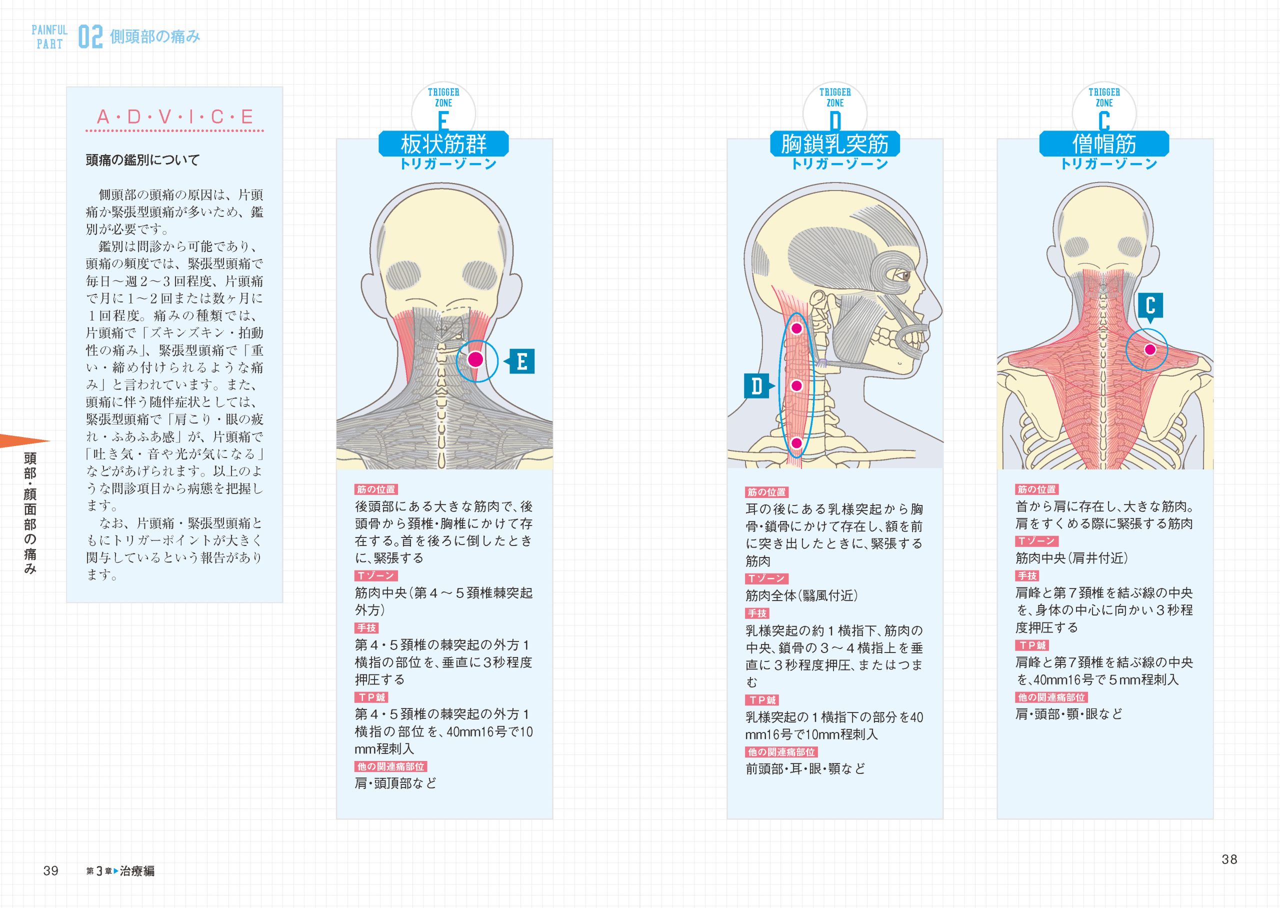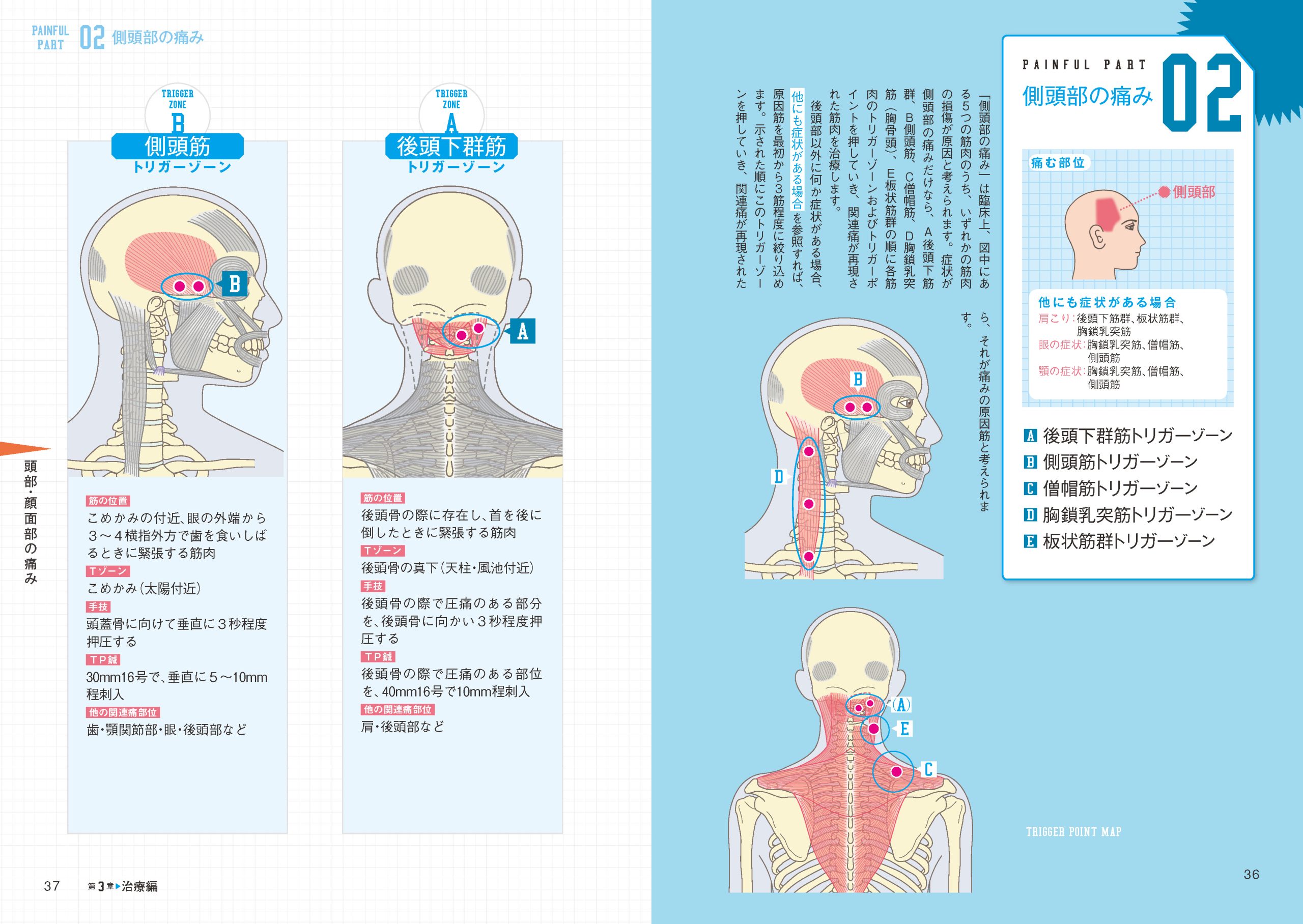 筋肉の損傷から派生する痛みの症状は、肩こりや腰痛はもちろん、頭痛や歯痛など、実にさまざま。本書では、身体全体の44部位の痛みについて、その原因になっている可能性のある筋肉をあげ、治療すべきトリガーポイント(TP)の位置が一目でわかるようになっています。痛み以外にも症状があれば、「原因筋」の候補数をさらに絞り込むことができます。シンプルな手技「TP圧迫」や、「鍼治療」をする際の刺鍼の方向や深さについて、各筋肉ごとにコンパクトにまとめているので、臨床ですぐ試せます。