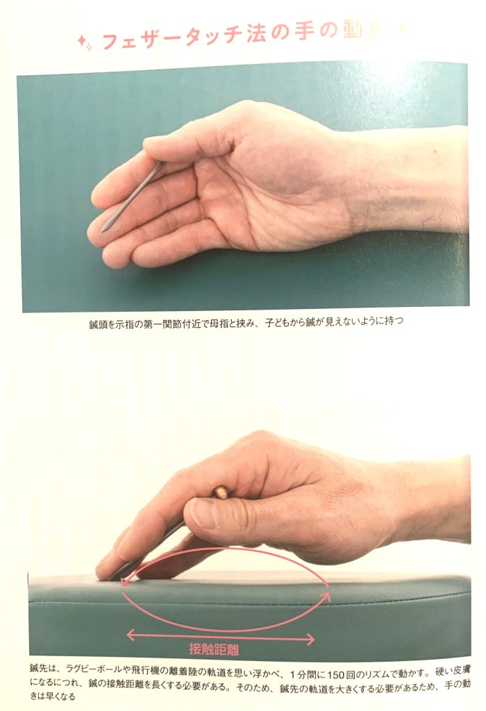 ヤキの入った三稜鍼を子どもから見えないように手掌の中に隠し、手前に引く動作を、1分間に150回のペースで、素早く繰り返すフェザータッチ法が大師流小児鍼のメインの技法。
